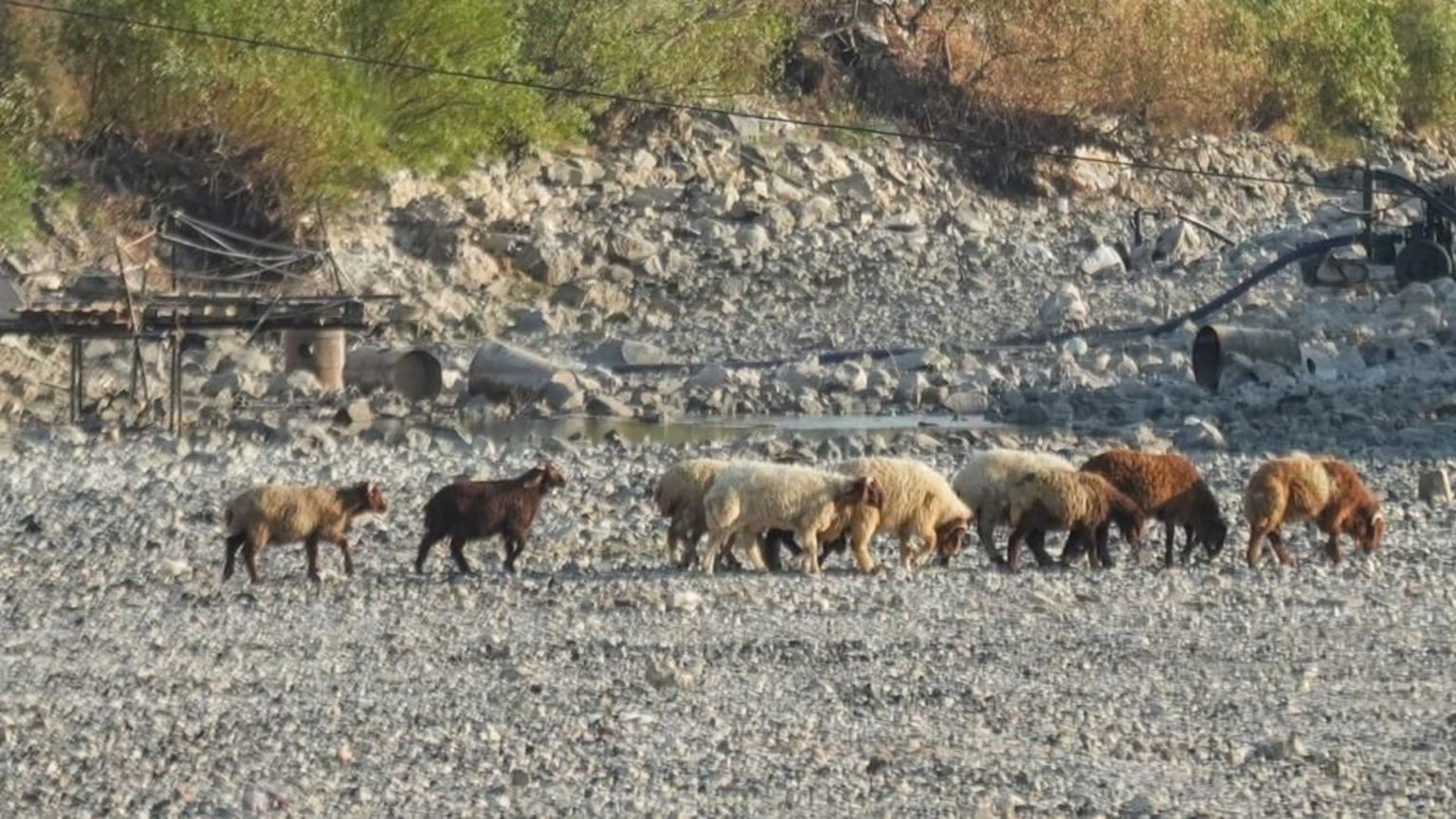 Sheep walk among the dried-out bed of the Orontes River in Jisr al-Shughour, northern Syria